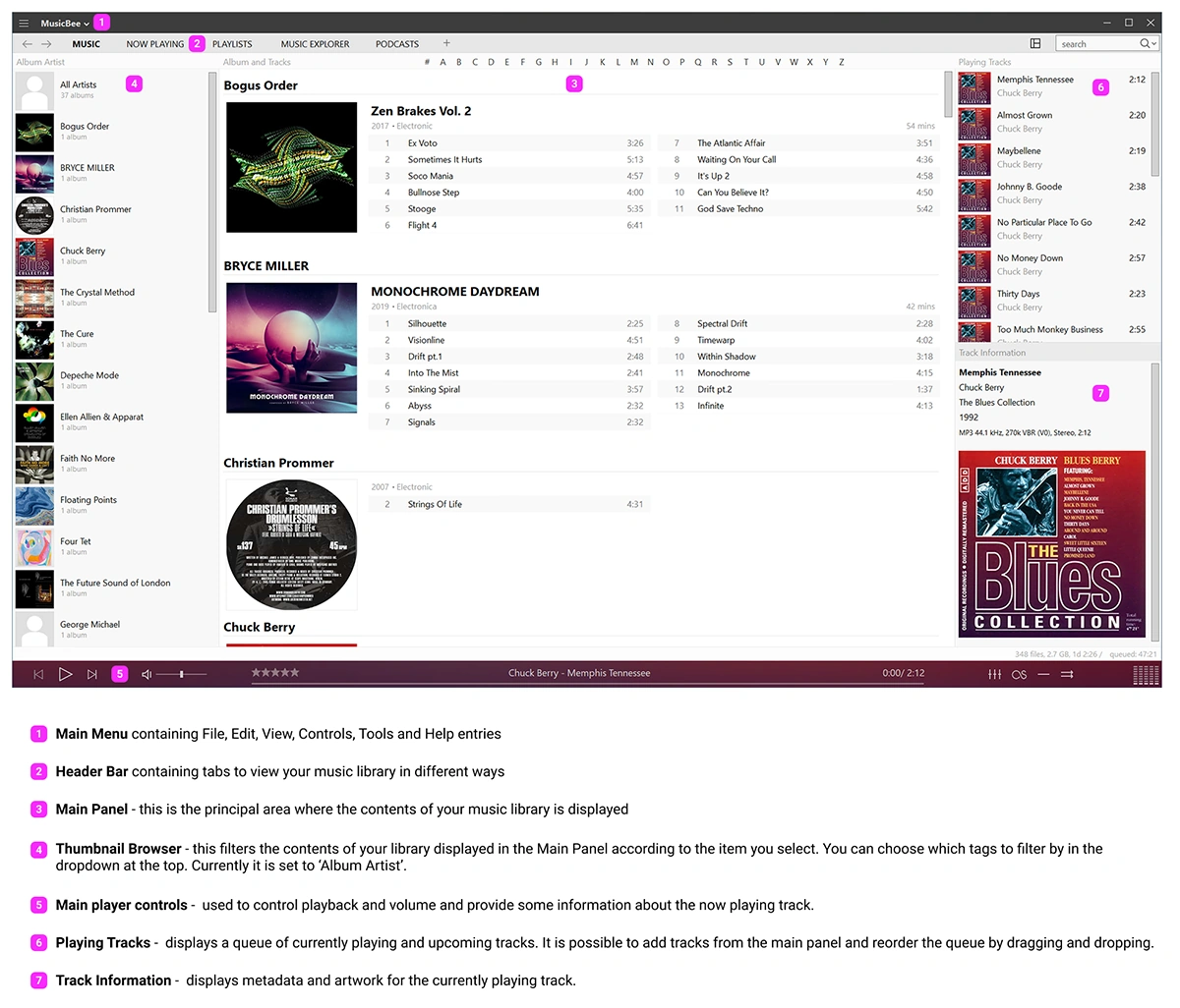 MusicBee has extensive capabilities for customizing the layout, appearance and behaviour to match your wishes, but this is beyond the scope of this article. It is recommended to first get used to the default setup before exploring the extended functionality described under the Customization tab, or on the forum.