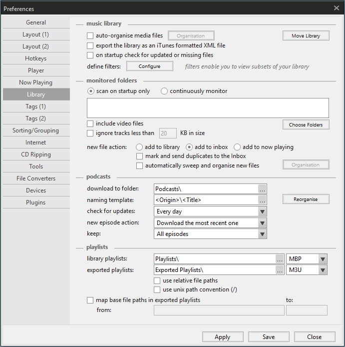 (Default: unticked) Will make playlists use relative paths for the tracks. Useful when the drive letter may change but the directory structure remains the same.