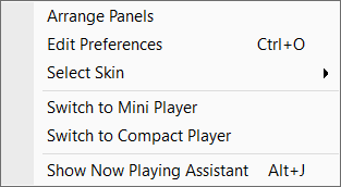 The icon at the top left of the MusicBee window contains a menu with popular items from the other menus. For the similar menu in the Compact Player, see Compact Player.