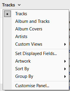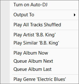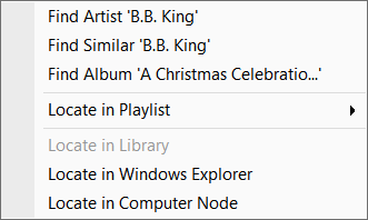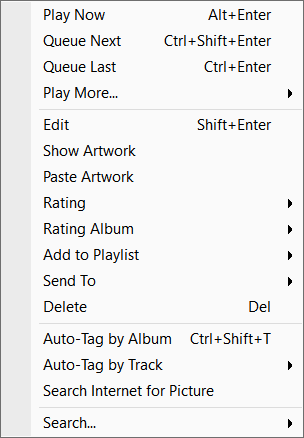 MusicBee has context menus almost everywhere. Right click on a panel or item, and you'll get a list of related options. The context menu for typical main panel views is an especially dense one. The menu shown at right is from Album & Tracks view, but other library views have the same general options, with some variation depending on where you click.