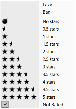 Rating Album is the same menu, only it applies to the album rather than the track. All tracks from the album will be updated with the album rating (this does not affect individual track ratings). If you prefer, you can configure automatic album ratings based on the average of track ratings, in Tags (1).