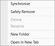 Only visible if a device is connected. Sync settings are shown in the main panel when the device is selected. You can right click to synchronize or remove a device. Each device can be expanded to show a simplified version of the Navigator for accessing the contents.
