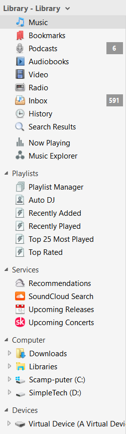 The Navigator panel is like a map of your library, providing quick access to different areas and easy targets for drag & drop operations. It is permanently located in the Left Sidebar. All navigation nodes except Music (which is permanent), Search Results (which comes and goes as needed), and Devices (which only appears when a device is connected) can be enabled or disabled via Layout Preferences. The panel is shown here with all options enabled.