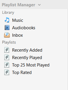 The Playlist Manager is sort of an overflow panel for playlists, since they are often short of space with everything else in the Navigator. It only shows Music, Audiobooks, Inbox, and playlists. All playlist folders are expanded automatically, and the "New" menu for playlists is available at the top left, as well as in context menus.