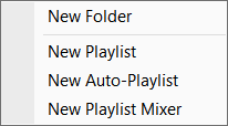 Right clicking anywhere in the playlist node will give you access to the "New" menu, where you can create playlists and playlist folders. Each individual playlist also has a "List" menu, which is covered in more detail on the playlists page.