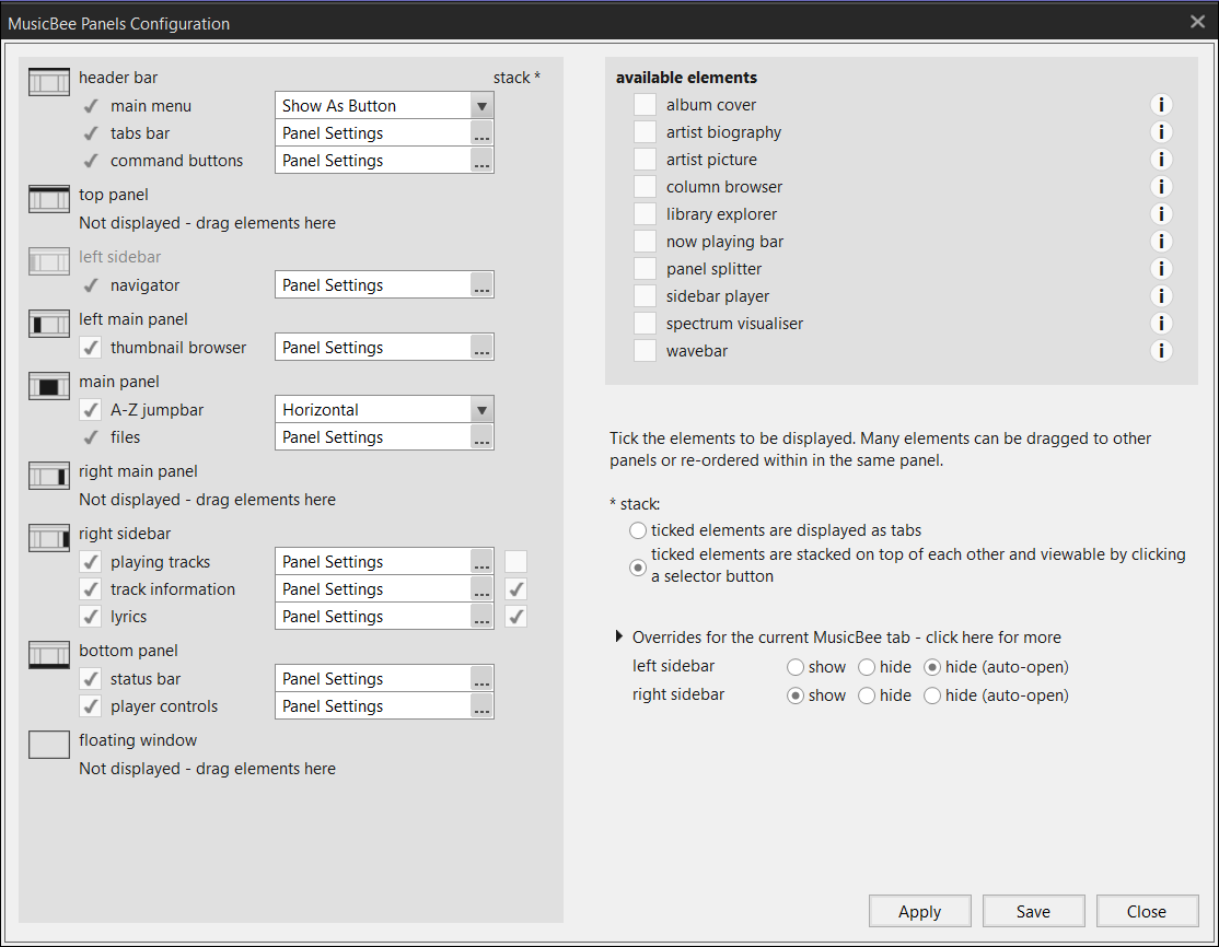 This page describes the main panels which go to make up MusicBee's interface (UI) and lists the different components which may be placed within these panels. The links lead to detailed information about each component. In addition there is a high level description of how to customise the layout through the Panels Configuration feature.